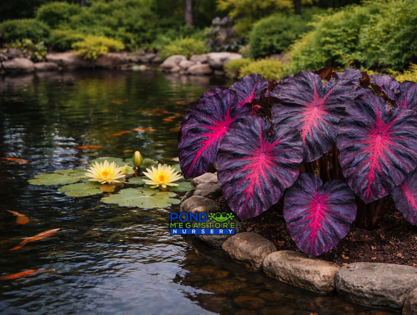 3-4 feet Tall , watch the deep pink explode as the dark black taro starts to reach maturity. As in most Taro with center colors this one sports its central colors around two feet tall and taller so be sure to fertilize your taro to get the larger leaves and if not planting in the ground provide an adequate size pot and soil. When growing in a pond we suggest never using any stones but always a heavy loam topsoil with clay and sandy base (topsoil is sand, silt and clay). Plant at the water surface and no more than roots below the waterline in part shade in warm conditions.